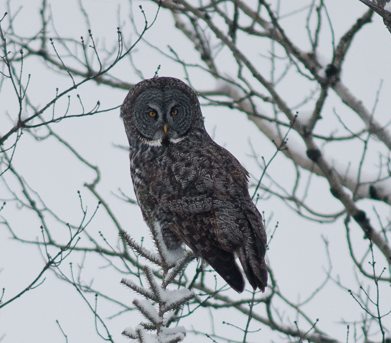 If our first day out was good, our second day could only be described as fantastic! For a great day in birding, location is only half the mix; timing is just as crucial. And on this snowy morning in the Sax Zim, we were lucky to be there on a day when Great Gray Owls were literally falling out of the trees (on to unsuspecting voles…). It was pretty special. There were a few birding groups working the bog that morning and we all stayed in touch with one another. With so many eyes looking, every so often, someone would call in another sighting of a Great Gray Owl! It was a little hard to sort out how many Great Grays we saw that day (I know problems right?!), but at the end of the day, we felt that we had seen six different birds over seven sightings.