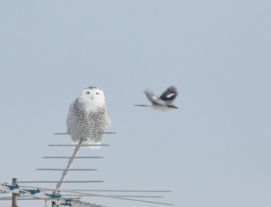 month, they were quite vocal and animated and spent more time chasing each other rather than eating the peanut butter at the roadside feeding station they were clustered around. These feeders are also a great spot for Boreal Chickadee, though we would not get good looks at this enigmatic bird till the second day of the tour. We were pleased to find a Snowy Owl by mid-morning, and a couple hours later had some fantastic looks at a Northern Hawk Owl that had taken up a winter-time residence on a road appropriately titled Owl Avenue.